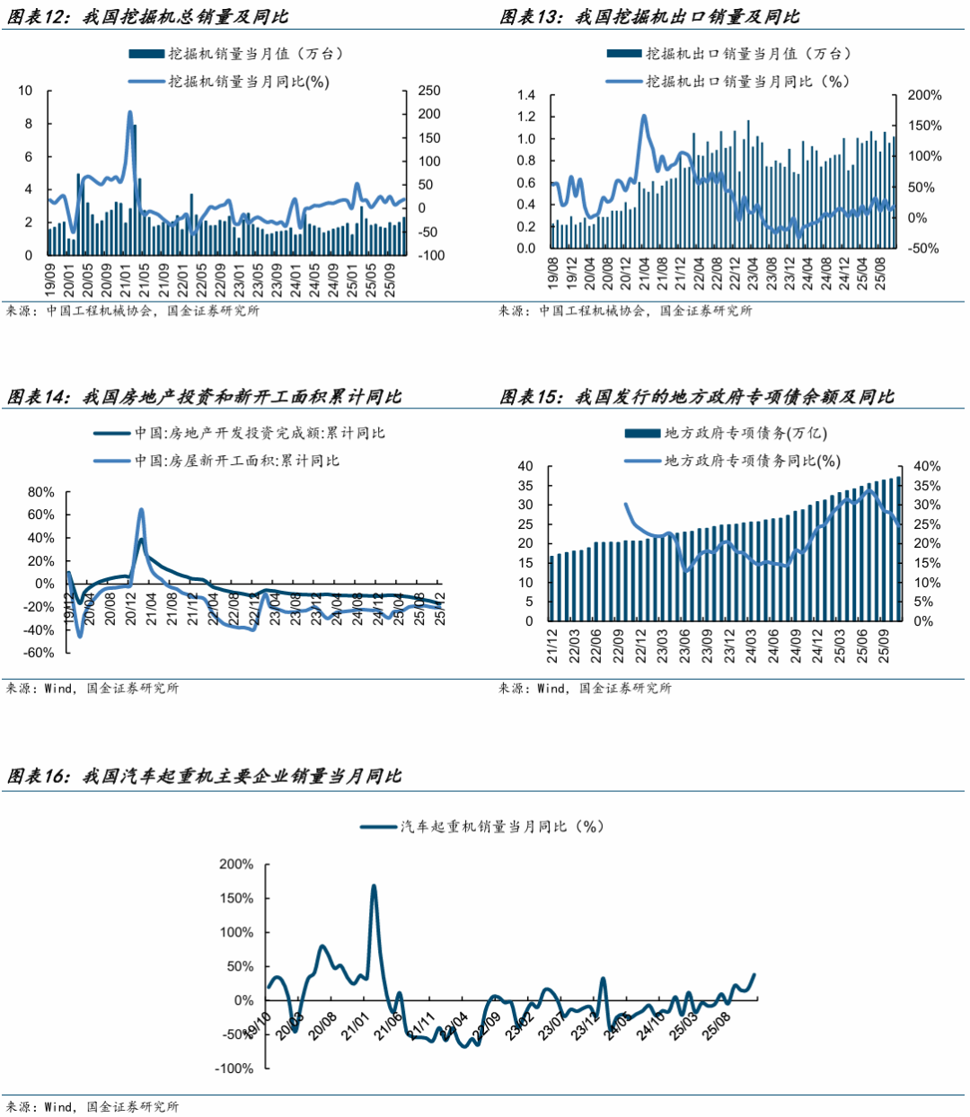 工程机械全球大周期向上,土方内外销超预期。根据中国工程机械工业协会,2026年1月销售各类挖掘机18708台,同比增长49.5%。其中国内销量8723台,同比增长61.4%;出口量9985台,同比增长40.5%,土方内外销超预期。25Q4卡特彼勒工程机械板块北美、EAME、亚太、拉丁美洲收入增速分别为+23%、+18%、-7%、+6%,25Q3北美、EAME、亚太、拉丁美洲收入增速分别为+8%、+6%、+3%、-1%,工程机械板块北美、EAME地区加速增长,拉美转正,中国工程机械内外销加速叠加海外龙头公司报表端均显示工程机械全球大周期上行。推荐徐工机械、恒立液压、三一重工、中联重科、柳工。
