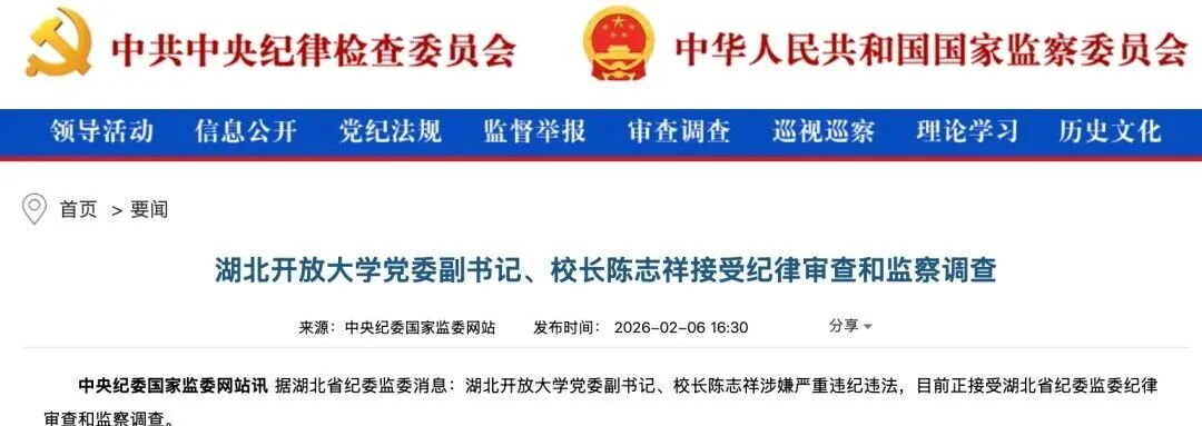 2026年2月,陈志祥涉嫌严重违纪违法,接受湖北省纪委监委纪律审查和监察调查。