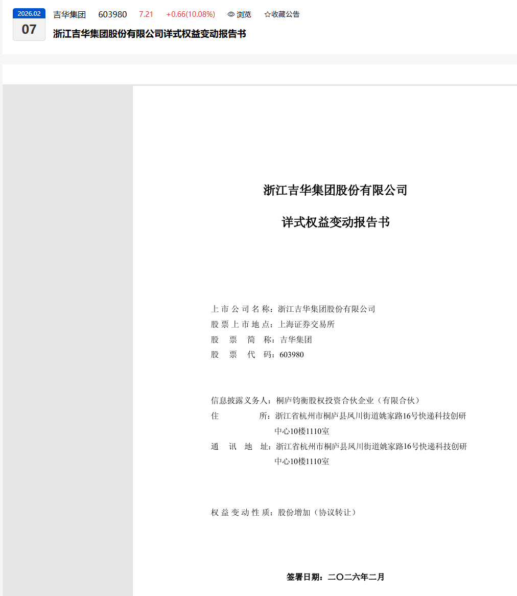 2026年首单港股上市公司收购A股主板公司案例诞生。港股上市公司环球新材国际控股有限公司通过其下设合伙企业,以总计近18亿元的代价,获得A股上市公司浙江吉华集团股份有限公司的控制权,成为其控股股东。