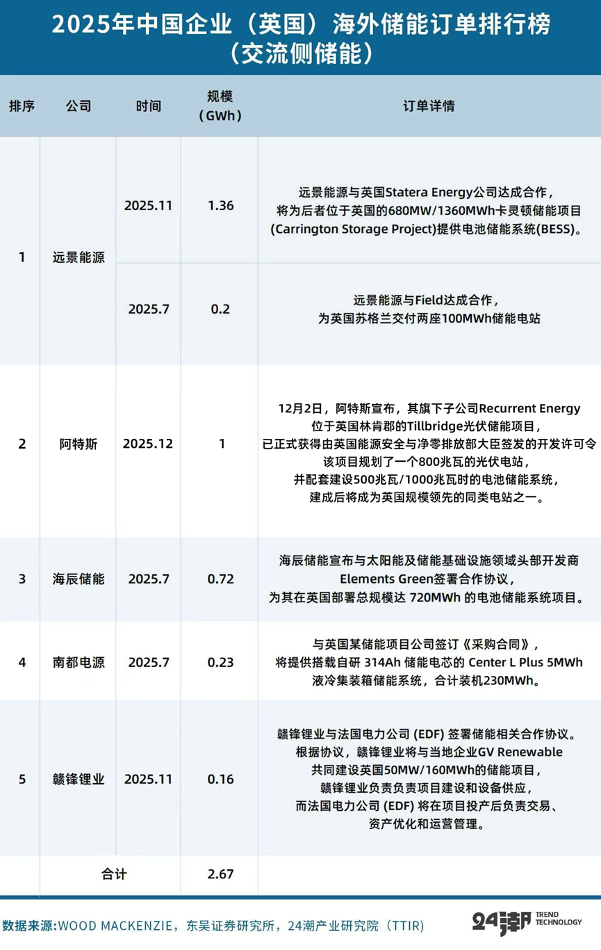 英国市场的爆发,考验的不仅是产品的成本,更是对复杂电力系统的深刻理解、对市场规则的灵活适应,以及从硬件到算法的全栈技术能力。正是在这样一个“高端局”中,中国储能企业凭借全方位竞争力脱颖而出。根据24潮不完全统计,2025年英国市场交流侧储能系统订单排名中,远景、阿特斯、海辰、南都、赣锋位居前五,中国企业占据核心地位。