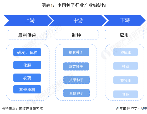 从农业种植产业链来看,种子属于前端行业。而从种子行业的产业链来看,种子终端产品属于中游生产的产成品。行业上游主要包括化肥原料、育种等领域,下游为种植业、林业等农业应用服务领域。
