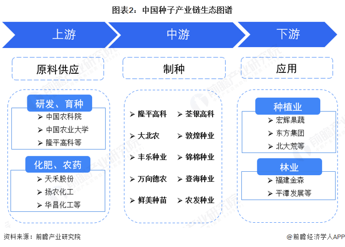 种子行业上游种子研发机构包括中国农业大学、中国农业科学院、隆平高科等;中游种子生产企业主要包括隆平高科、登海种业、丰乐种业、万向德农、荃银高科等;下游种植业企业主要包括东方集团、宏辉果蔬等,林业企业包括福建金森、平潭发展等。
