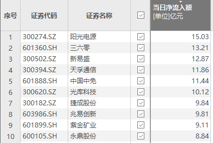 上证报中国证券网讯(记者 费天元)Choice数据显示,2月9日,资金净流入额排名前十的个股依次是阳光电源、三六零、新易盛、天孚通信、中国中免、光库科技、捷成股份、兆易创新、紫金矿业、永鼎股份。其中,阳光电源获净流入15.03亿元。