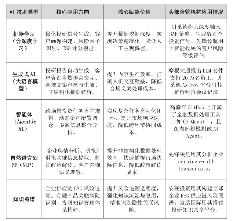 具体来看,欧洲资管机构侧重AI与ESG投资、数据隐私合规的融合,美国机构则聚焦于投资Alpha生成、交易效率提升等市场化场景,形成各具特色的发展路径。