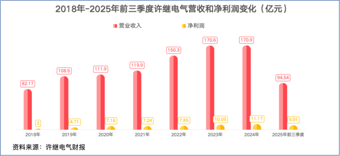 将目光再拉近了看,不难发现许继电气出现营收增长难题,就2025年三季报情况来看,公司营收增速出现负水平,与行业增长景象不成正比。