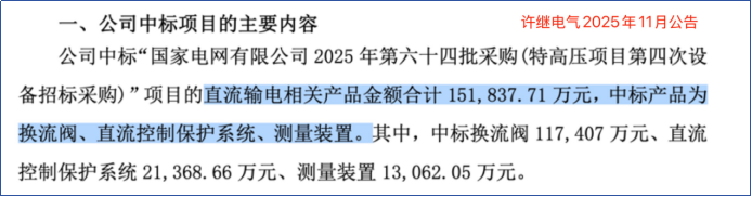 2025年11月末,许继电气发布产品中标的自愿性信息披露公告,公司中标国网直流输电相关项目,为其提供换流阀、直流控保和测量装置产品,合计金额约15.18亿元。