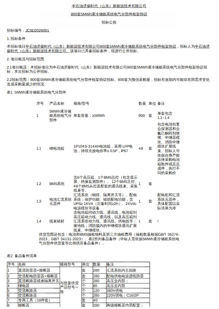 项目概况:本招标项目为中石油济柴时代(山东)新能源技术有限公司800套5MWh液冷储能系统电气分部件框架协议招标,本次招标为公开招标。