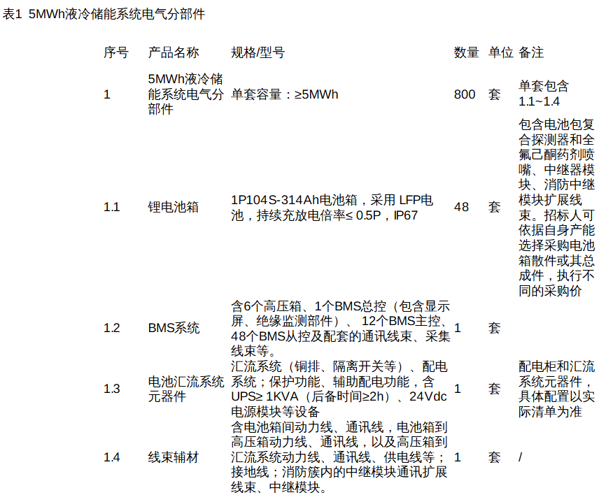 招标范围:800套5MWh液冷储能系统电气分部件框架协议招标。800套为预估采购量,招标有效期内可能存在因需求变化造成采购量减少的情况。