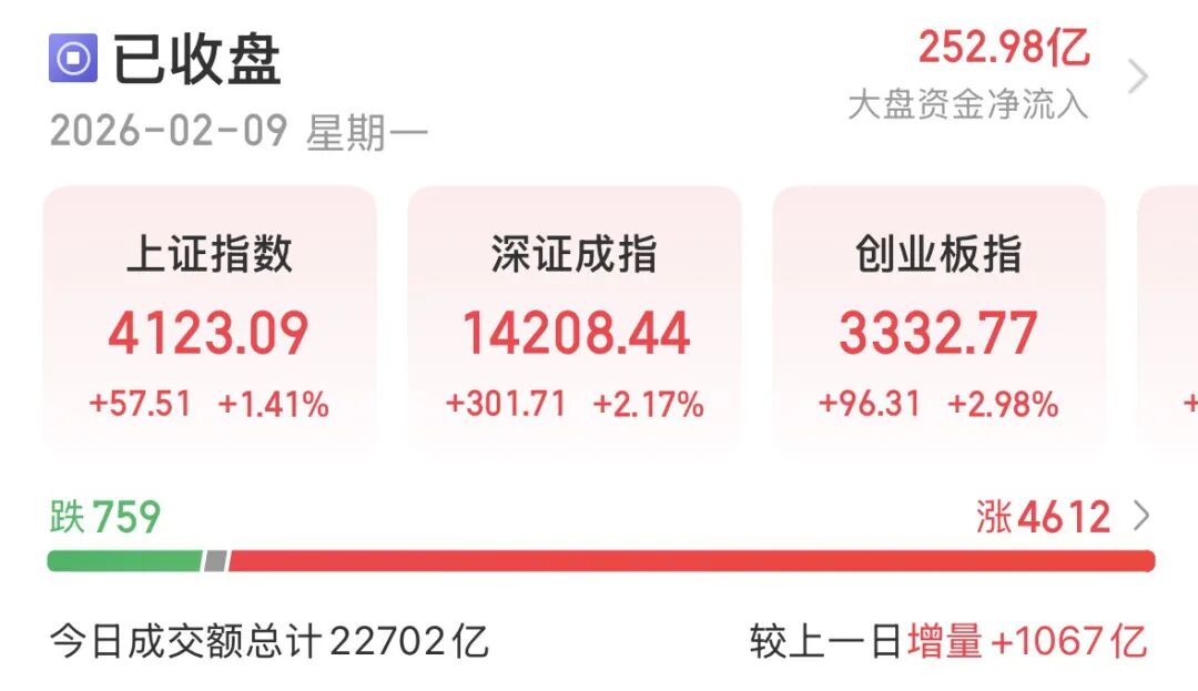 2月9日,A股迎来普涨行情,双创指数涨近3%,4612只个股收红,光通信模块、影视概念等板块涨幅靠前。