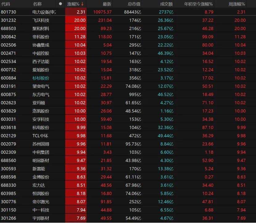 18只电力设备个股涨停,飞沃科技、聚和材料“20cm”涨停,协鑫集成、中超控股、西子洁能、爱旭股份、杉杉股份等涨停。