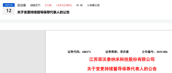 江苏菲沃泰纳米科技股份有限公司(以下简称 “公司”)于近日收到中国国际金融股份有限公司(以下简称 “中金公司”)出具的《关于变更持续督导保荐代表人的通知函》。中金公司作为公司首次公开发行股票并在科创板上市项目的保荐机构,原委派莫永伟先生、成杰先生履行持续督导职责,持续督导期预计至 2025 年 12 月 31 日止。现因成杰先生工作调整,不再负责对公司的持续督导工作。为保证持续督导工作有序进行,中金公司现委派徐璐女士(简历见附件)接替成杰先生担任公司的保荐代表人,继续履行持续督导职责。本次变更后公司首次公开发行股票并在科创板上市项目的保荐代表人为莫永伟先生和徐璐女士。