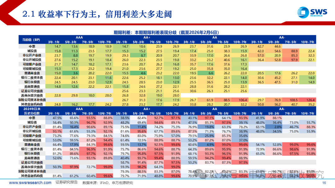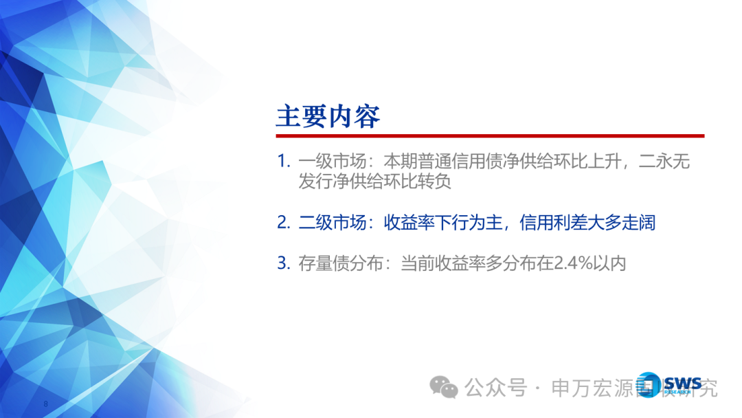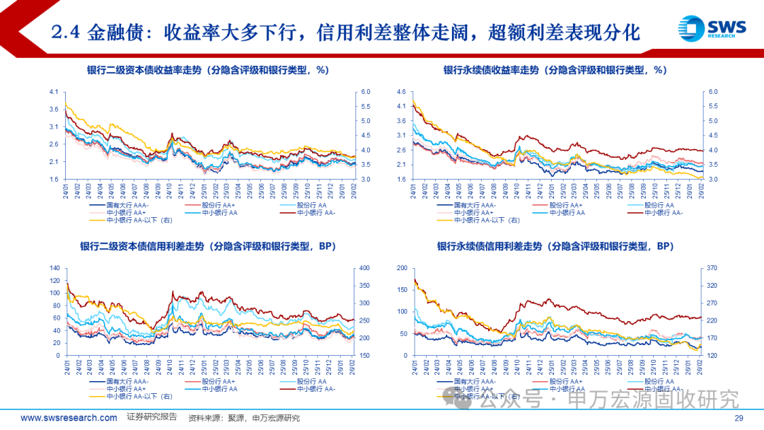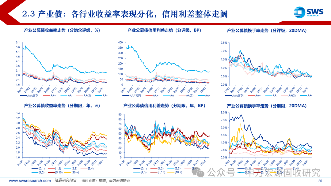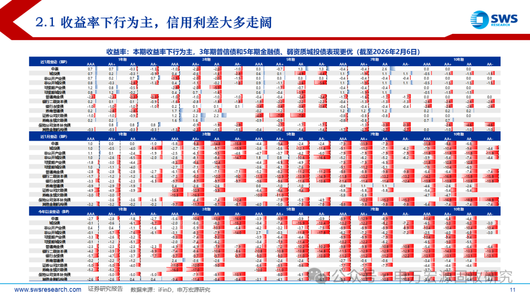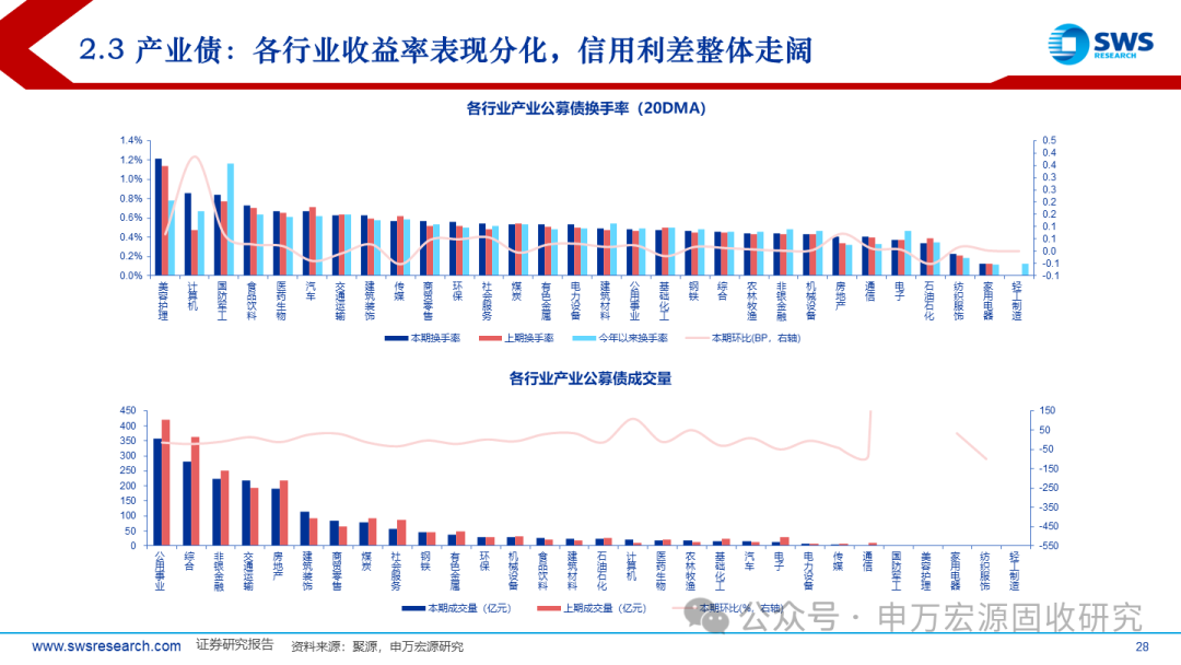 二级市场:收益率下行为主,信用利差被动走阔,3年普信债和5Y金融债、弱资质城投债表现较好。具体来看,收益率方面,3年普信债和5Y金融债、弱资质城投债表现较好,其中,3Y普信债中AA级可续期产业债下行幅度最大(-5.34BP),5Y弱资质城投债下行幅度也较多(AA/AA-级分别-4.89/4.39BP);5Y金融债中券商次级债下行幅度最大(AAA-/AA+/AA级分别为-3.98/-6.98/-6.98BP),5Y二永债表现较好、收益率全面下行(AA+/AA/AA-级二级资本债均为-2.17BP;各等级永续债均为-3.42BP)。信用利差方面,除1Y商金债、部分弱资质城投债、10Y二永债等小部分品种信用利差小幅收窄外,其他信用品种大多走阔,5Y AA级城投债表现最好(-1.24BP),5Y高等级普信债走阔幅度较大(5Y AAA级中票和城投债分别+3.98/4.26BP)。本周普信债、银行永续债换手率下降,银行二级资本债换手率上升。