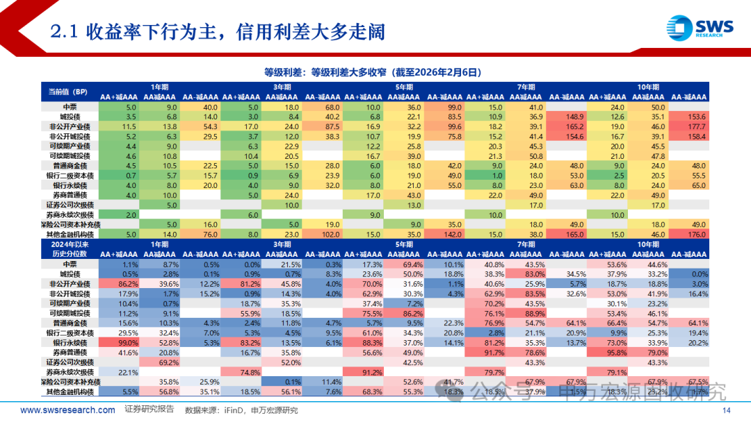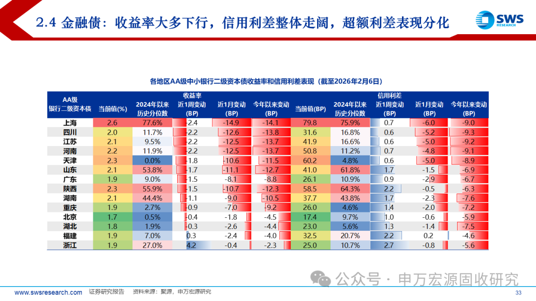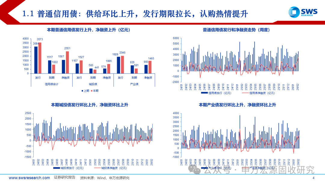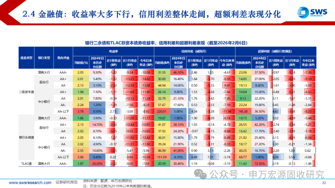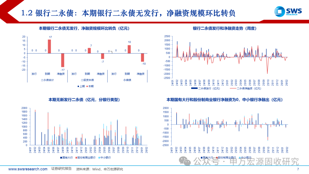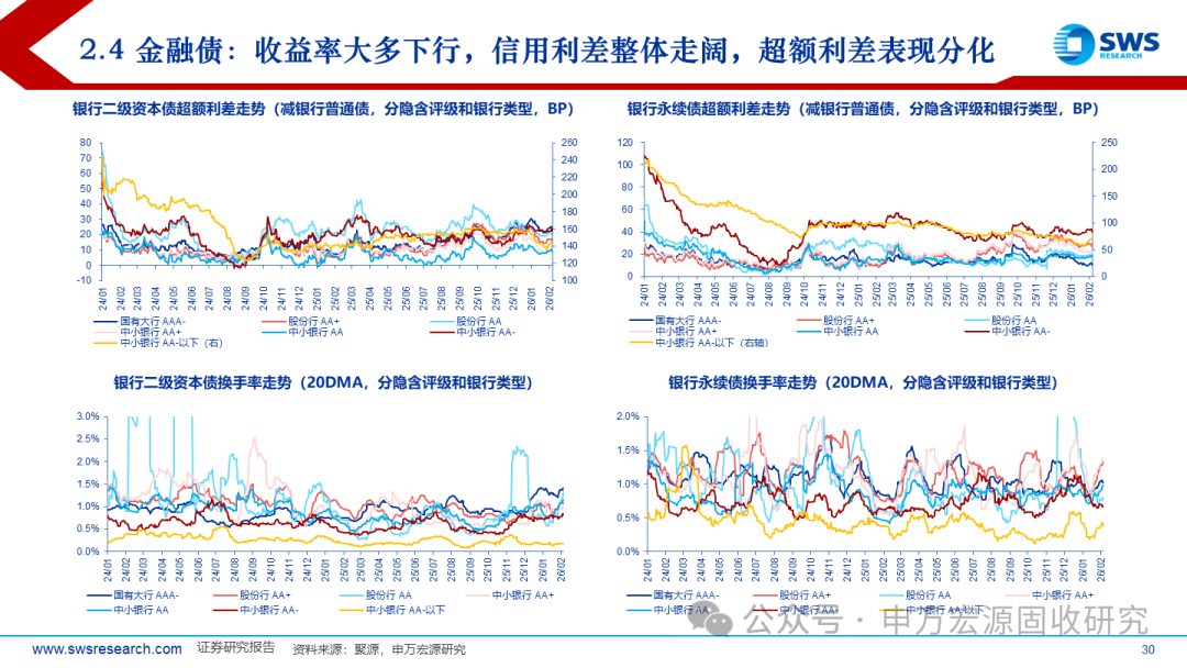 一级市场:本期普通信用债净供给环比上升,二永无发行净供给环比转负。本期(2026.02.02-2026.02.08)普通信用债合计发行/净融资3573亿元/2551亿元,上期(2026.01.26-2026.02.01)分别为3084亿元/1567亿元。其中,产业债发行环比小幅上升至2046亿元,净融资环比上升至1465亿元;城投债发行环比上升至1527亿元,净融资环比大幅上升至1086亿元,为2024年以来的最高值。本期银行二永债无发行,连续5周无发行。二级资本债到期2只,净融资环比转负至-7亿元;永续债到期1只,净融资环比转负至-10亿元。