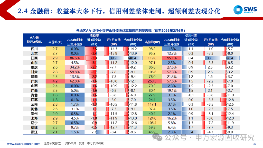 信用策略:套息适度拉长久期至3-5年,同时关注中短端票息资产,以及ETF成份券的潜在性价比。展望2月,政策、经济数据空窗期+基本面生产淡季+资金宽松支撑+年初配置力量偏强,整体对债市有利。信用债方面,资金面宽松支撑下,中短端信用债套息策略确定性较高,可“逢跌增配”。摊余债基需求支撑下,套息可适度拉长久期至3-5年中高等级普信债。同时考虑到当前信用利差已处于历史相对低位,继续压缩的空间相对有限,建议关注部分品种和等级下沉的票息价值。结合估值情况,可重点关注2年以内头部央国企地产债、3年及以内弱资质城投债、3年左右中高等级永续或私募普信债、以及3-5年高等级保险次级债的参与机会。此外,开年以来信用债ETF持续下滑,成份券相对非成份券的超额利差持续修复,部分期限和等级成份券超额利差已经回到2025年以来的相对高位、甚至接近或超过0BP,未来潜在继续调整空间相对有限,可筛选曲线凸点上(2.5-3Y和4-4.5Y)流动性较好、估值性价比较高的PCF成份券进行布局,关注和等待后续信用债ETF规模企稳和重新扩容的机会。对于二永债而言,近期估值性价比虽有所回升但仍然较低。同时近2周保险机构对二永的配置力量有所减弱,或因固收+基金规模增长,基金仍在增配二永,今年以来二永尚无新发,结合估值和供需变化,建议对二永多看少动,等待后续估值回升或供给上量的机会。