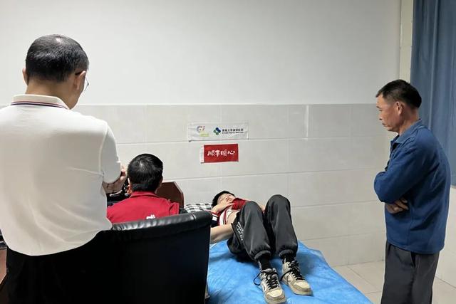 躺在诊疗床上接受检查的李小,双眼紧闭(右1:李小爸爸)