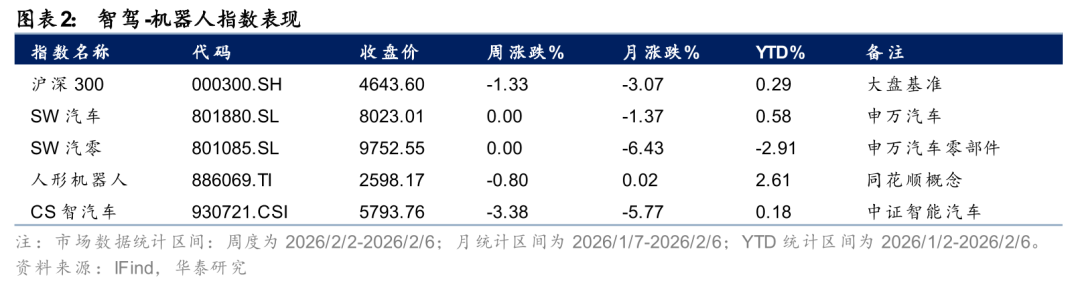 上周大盘小幅回调,智驾与机器人板块整体承压、结构上个股呈现分化。上周(2026/2/2-2026/2/6)沪深300指数下跌1.33%,中证智能汽车指数下跌3.38%,跑输大盘;同花顺人形机器人概念指数下跌0.80%,表现相对抗跌。