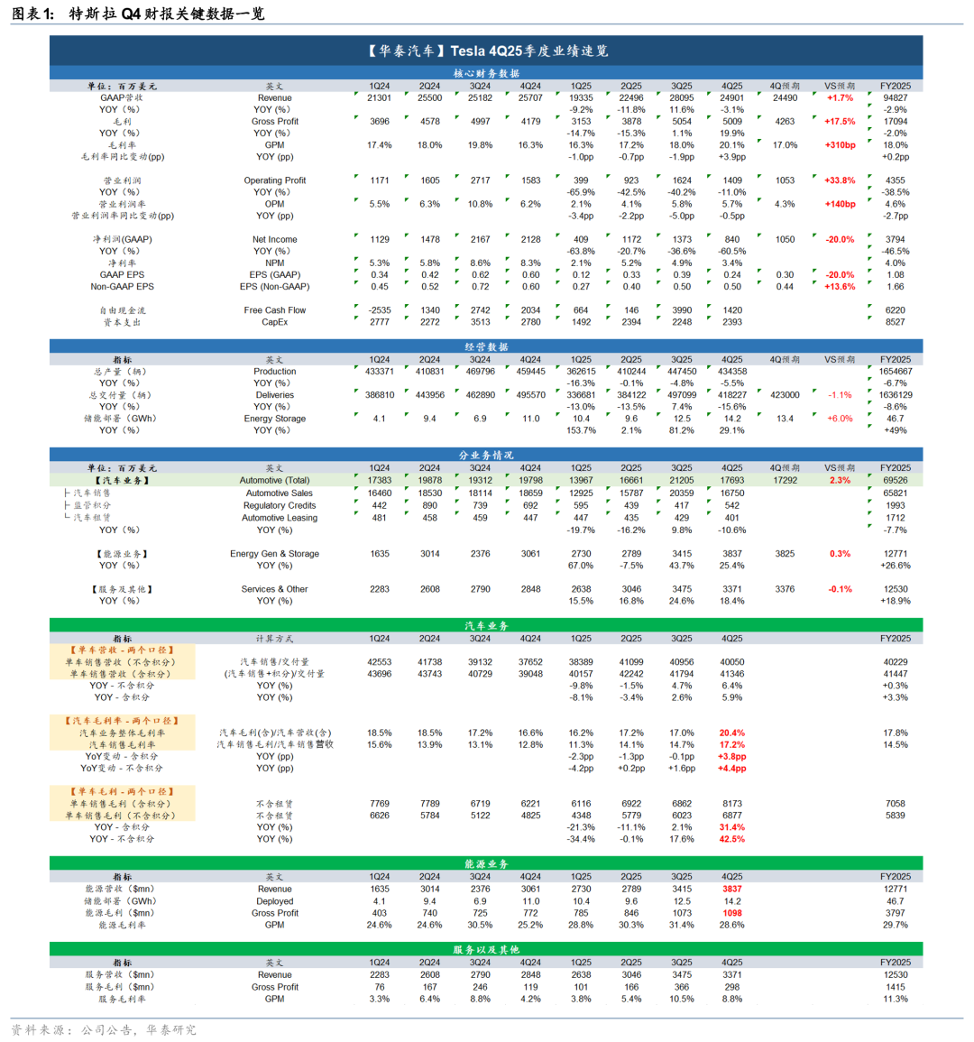 Q4毛利率超预期,物理AI转型加速。公司公布25Q4业绩:Q4营收249亿美元,yoy-3%/qoq-11%,略超市场预期(245亿美元);Non-GAAP EPS 0.50美元,yoy-16%/qoq持平,超预期14%;GAAP EPS 0.24美元,yoy-60%/qoq-38%,低于预期(0.30美元),主要受比特币持仓贬值及股权激励费用大增影响。Q4业绩核心亮点是毛利率达20.1%,大超预期的17.0%,为两年最高水平。我们认为尽管汽车交付承压,但盈利能力触底反弹叠加AI战略加速推进,公司正加速从“电动车企”向“物理AI公司”转型。