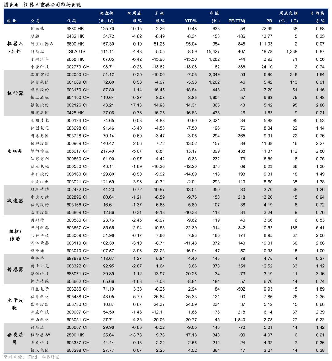2) 从结构看,银轮股份、恒立液压周涨超10%,电子皮肤概念(鹿山新材、岱美股份、福莱新材)逆势走强;而前期涨幅较大的丝杠(浙江荣泰周跌-3.10%、新坐标周跌-3.96%)、减速器(绿的谐波周跌-5.07%)及本体(优必选周跌-10.15%)出现获利回吐。