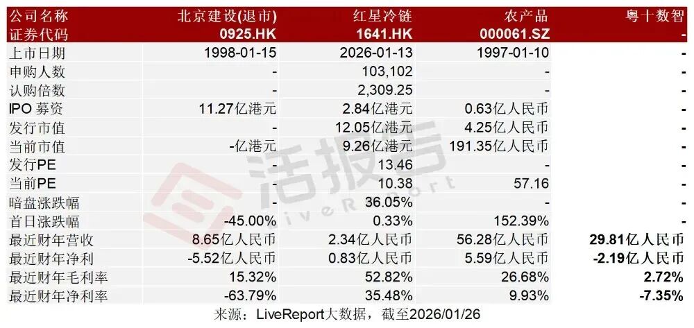 同行业IPO可比公司:北京建设(退市)(0925.HK)、红星冷链(1641.HK)、农产品(000061.SZ)