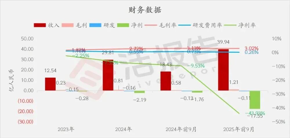 公司是一家数智化驱动的企业,2024年收入29.81亿元,净亏损2.19亿元,毛利率2.72%。2025年前9月收入39.94亿元,净亏损17.55亿元,毛利率3.02%。2025年前三季度亏损扩大。