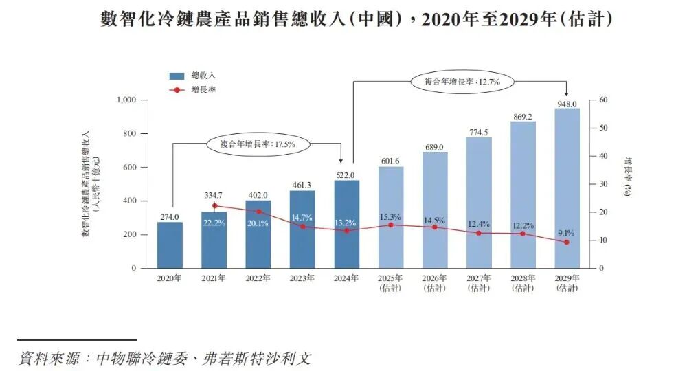 根据弗若斯特沙利文(Frost & Sullivan)报告,中国数智化冷链农产品销售市场的市场规模由2020年的人民币2,740.0亿元扩展至2024年的人民币5,220.0亿元,相当于复合年增长率17.5%。预计市场将维持稳健增长势头,至2029年规模预计约达人民币9,480.0亿元,即2024年至2029年的复合年增长率为12.7%。