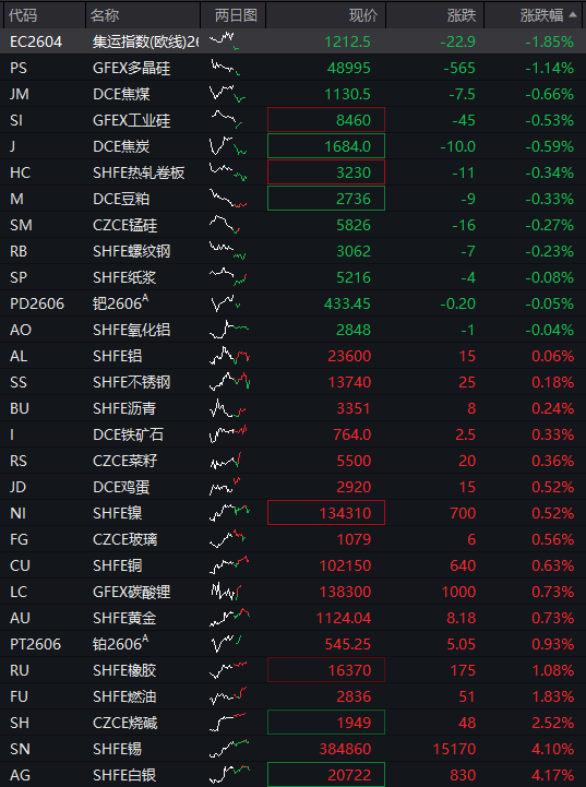 商品:国内商品期货涨跌互现,截至发稿,集运指数、多晶硅跌超1%,焦煤、工业硅、焦炭、热轧卷板、豆粕、锰硅、螺纹钢、纸浆、钯金、氧化铝等下跌。不锈钢、沥青、铁矿石、菜籽、鸡蛋、沪镍、玻璃、沪铜、碳酸锂、沪金、铂金等上涨,橡胶、燃油涨超1%,烧碱涨超2%,沪锡、沪银涨4%。