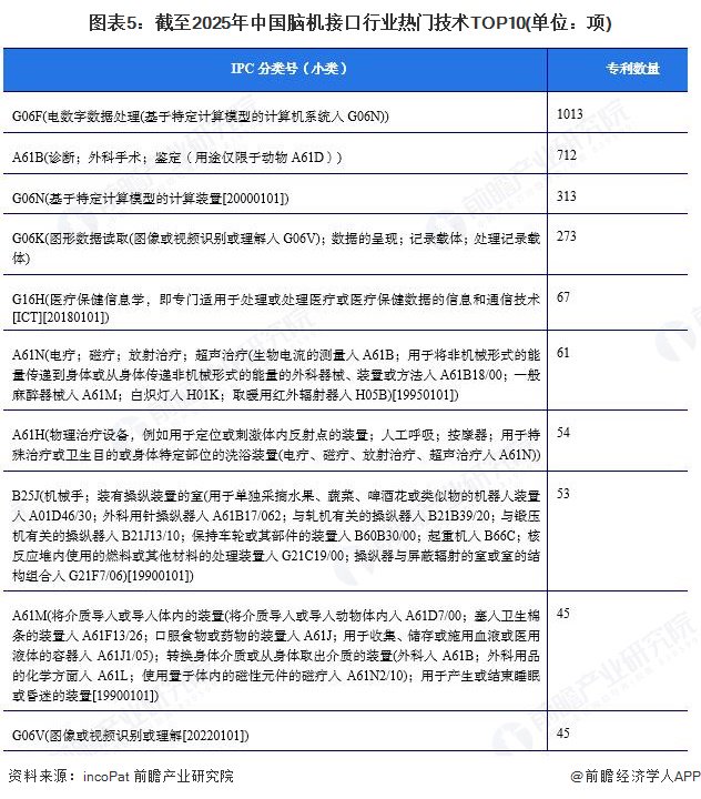 从热门技术来看,我国脑机接口行业热门技术专利数量最多的是G06F(电数字数据处理(基于特定计算模型的计算机系统入G06N)),共有1013项专利,其次是A61B(诊断;外科;鉴定(分析生物材料入G01N,如G01N33/48))和G06N(基于特定计算模型的计算装置[20000101]),分别有712项和313项。