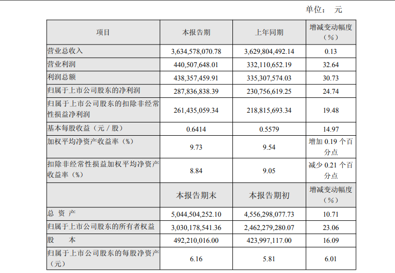 从业绩快报数据来看,千金药业2025年经营基本面稳中有升,利润端表现亮眼。报告期内,公司实现营业总收入约36.35亿元,同比微增0.13%,营收规模保持稳健;营业利润约4.41亿元,同比大幅增长32.64%,利润总额约4.38亿元,同比增长30.73%;归属于上市公司股东的净利润约2.88亿元,同比增长24.74%,扣除非经常性损益后的归母净利润约2.61亿元,同比增长19.48%;基本每股收益0.6414元/股,同比提升14.97%,盈利能力稳步提升。