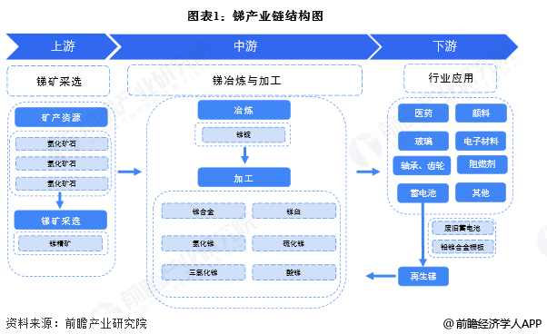 锑,英文名称Antimony,元素符号:Sb,外观为质脆有光泽的银白色固体。锑具有稀缺性的同时,工业价值很高,常被用作工业生产中的添加剂,因此被国家列入战略性矿产资源,严格管控。锑产业链的上游主要是锑矿的开采以及选矿,得到可以被加工的锑精矿;产业链中游主要是锑的冶炼以及加工,产品主要包括高纯金属锑、锑合金、锑白、锑化合物等、下游主要是锑加工产品的应用,主要包括阻燃剂、玻璃、电子材料、轴承齿轮以及蓄电池等。其中,蓄电池中的锑可以进行回收,作为再生锑,重新进行冶炼和加工。