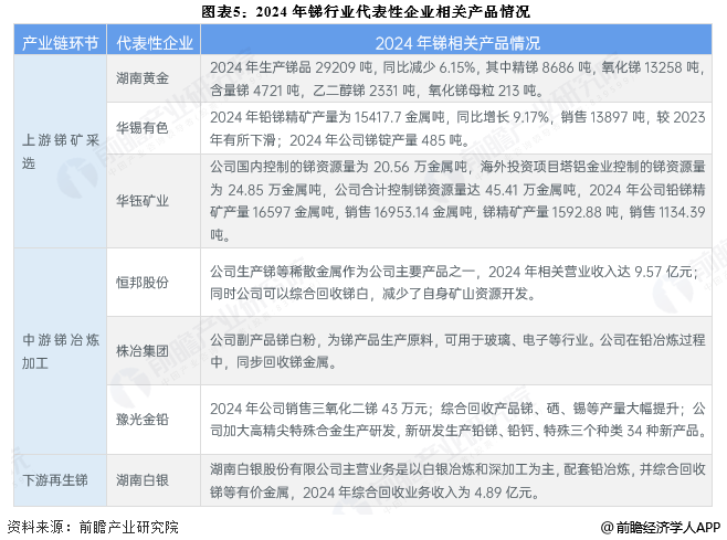 目前,锑产业链上游锑矿采选代表性企业主要是湖南黄金、华锡有色以及华钰矿业;中游冶炼与加工的代表性企业主要有恒邦股份、株冶集团、铜陵有色以及湖南黄金;下游应用领域较多,其中包括阻燃剂、医药、颜料等;再生锑代表性企业湖南白银。