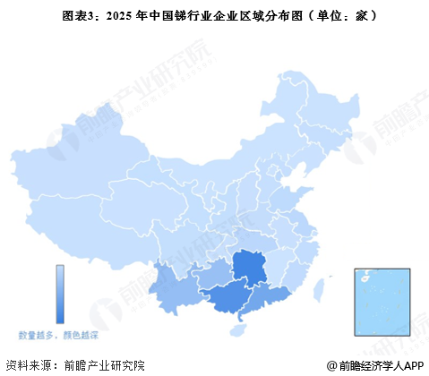 锑产业链区域热力地图:湖南、广西、广东分布最集中从我国锑行业企业区域分布来看,企业主要分布湖南地区,其次是在广西、广东、江西等西南地区;其余地区虽然有企业分布,但是数量较西南片区差距较大。
