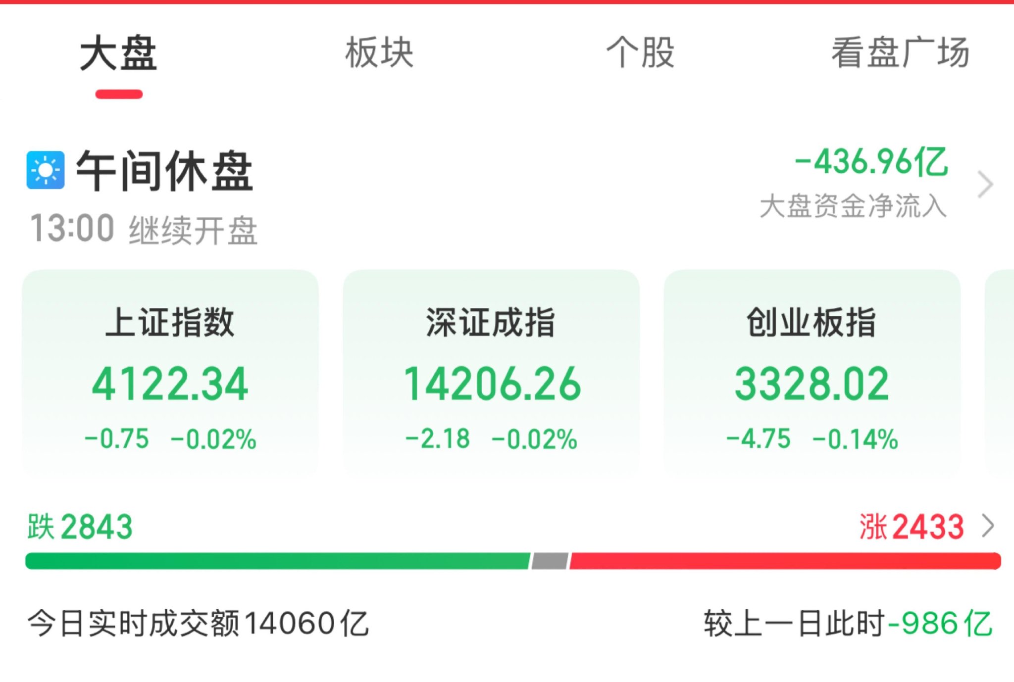 A股三大指数早盘震荡调整,截至午盘,沪指跌0.02%,深成指跌0.02%,创业板指跌0.14%,北证50指数跌0.72%,沪深京三市半日成交额14060亿元,较上日缩量986亿元。全市场超2800只个股下跌。