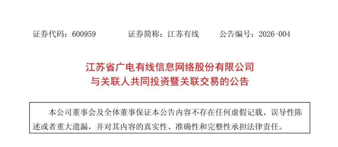 2月9日,江苏有线发布《与关联人共同投资暨关联交易的公告》。