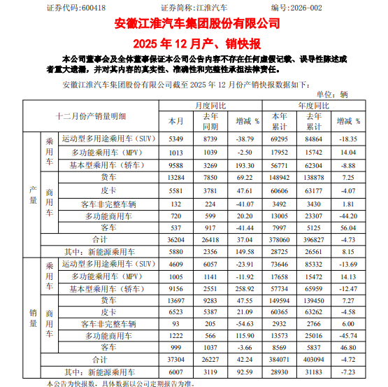 根据江淮汽车公告披露,2024年度,江淮汽车营业收入为421.16亿元,同比下滑6.28%;归母净利润为亏损17.84亿元,同比由盈转亏。销量方面,2024年江淮汽车乘用车累计销量为16.68万辆,同比下滑16.59%;商用车累计销量为23.63万辆,同比微增0.38%;2025年江淮汽车实现销量为38.41万辆,较同期的40.31万辆下滑4.72%,连续两年下滑。其中,新能源乘用车累计销量为2.89万辆,较同期的3.12万辆下滑7.23%。