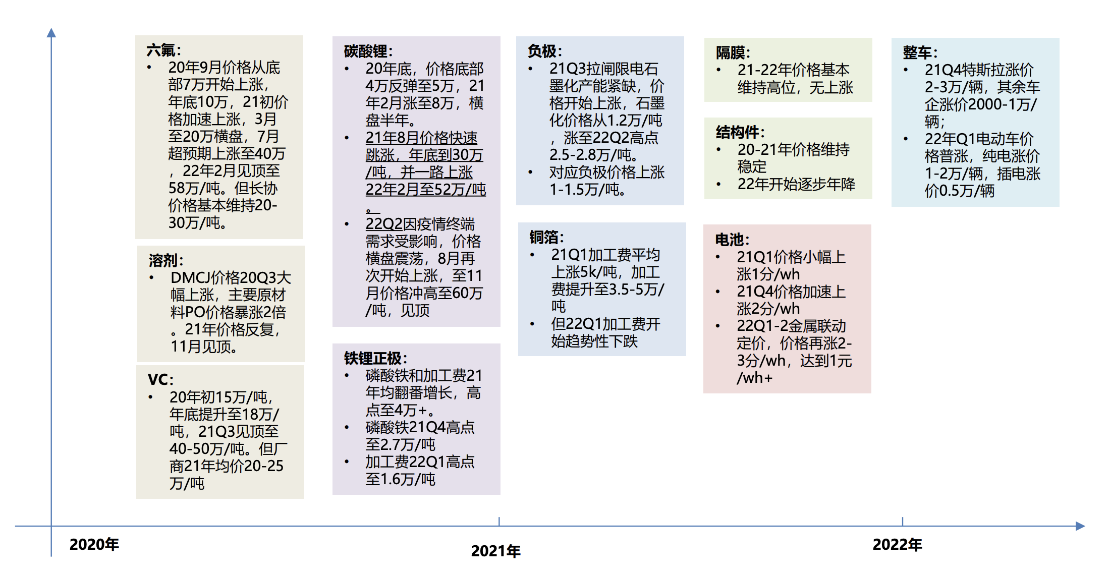 电解液(六氟磷酸锂)率先启动 → 碳酸锂小幅反弹 → 正极、负极加工费上行 → 碳酸锂进入主升浪 → 电池与整车端全面涨价。