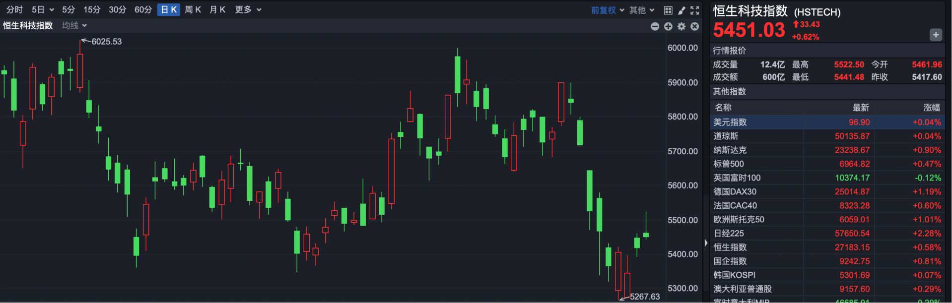 恒生科技指数收盘报5451.03点,上涨33.43点,涨幅0.62%。