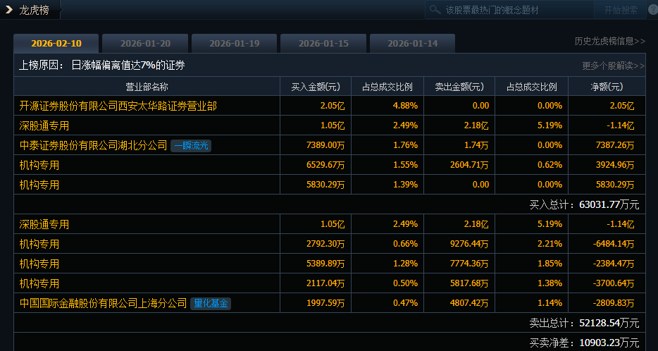 视觉中国(000681)今日涨停,成交额42.07亿元,换手率21.19%,盘后龙虎榜数据显示,深股通专用席位买入1.05亿元并卖出2.18亿元,2家机构专用席位净买入9755.24万元,有3家机构专用席位净卖出1.26亿元。开源证券西安太华路证券营业部净买入2.05亿元。