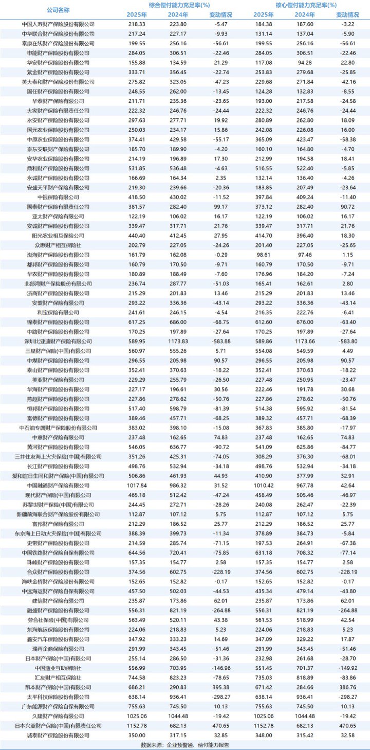 财产险公司的偿付能力指标在2025年总体保持稳定,绝大部分公司的资本充足水平远高于监管要求。