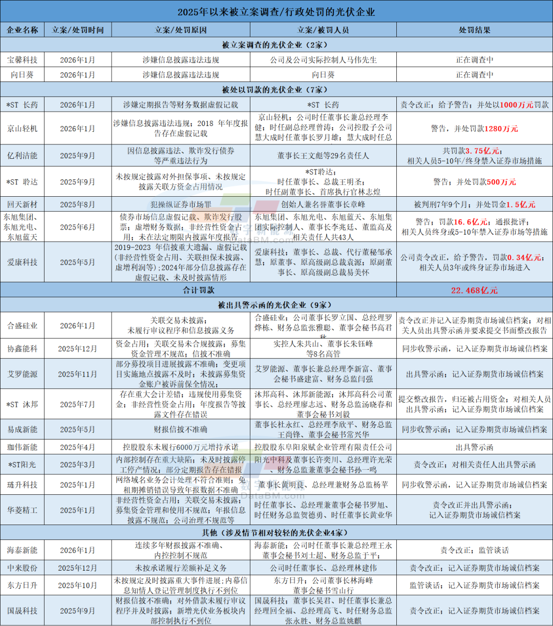 据数字新能源DataBM.com不完全统计,自2025年以来,已有超20家光伏企业被证监会立案调查、出具警示函、或遭警告罚款,合计超22亿元。