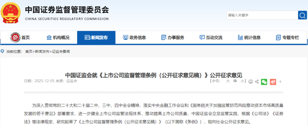 尤其是2025年12月,证监会发布《上市公司监督管理条例(公开征求意见稿)》,这意味着我国资本市场将迎来首部专门的上市公司监管行政法规。