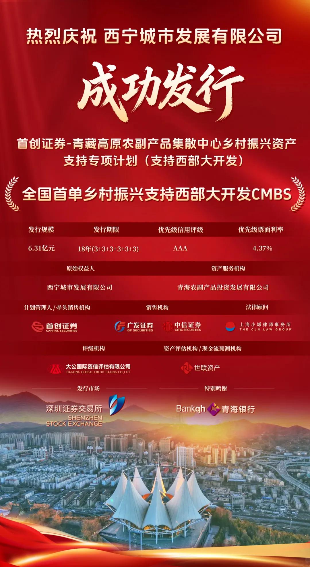 2月4日,由首创证券担任计划管理人及销售机构的“首创证券-青藏高原农副产品集散中心乡村振兴资产支持专项计划(支持西部大开发)”正式设立。该产品系全国首单乡村振兴叠加西部大开发战略的CMBS(商业房地产抵押贷款支持证券),也是原始权益人西宁城市发展有限公司在公开资本市场的首次亮相。