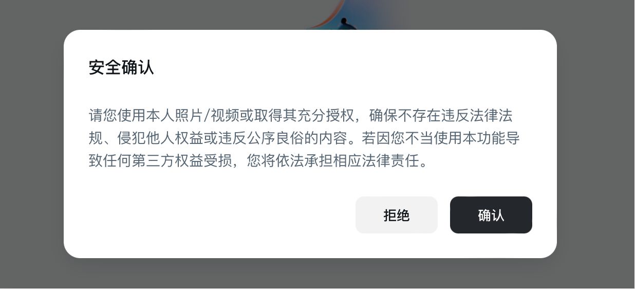 不过,同日,记者在即梦平台实测时发现,当要求Seedance 2.0根据一张人物图片生成视频时,界面随即弹出安全确认弹窗:“请您使用本人照片/视频或取得其充分授权,确保不存在违反法律法规、侵犯他人权益或违反公序良俗的内容。若因您不当使用本功能导致任何第三方权益受损,您将依法承担相应法律责任。”
