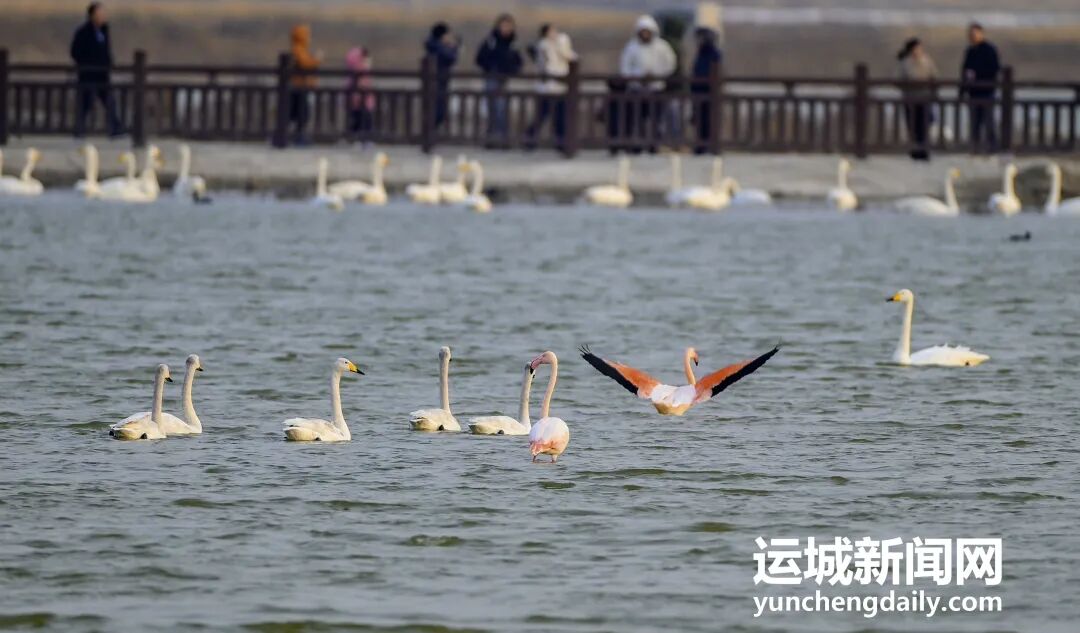 2月6日,4只火烈鸟与上百只白天鹅在运城盐湖天鹅栖息地相遇。红羽映波,白羽弄影,它们和谐相伴、逐水嬉戏,共同绘就了一幅灵动的冬日盐湖唯美画卷。