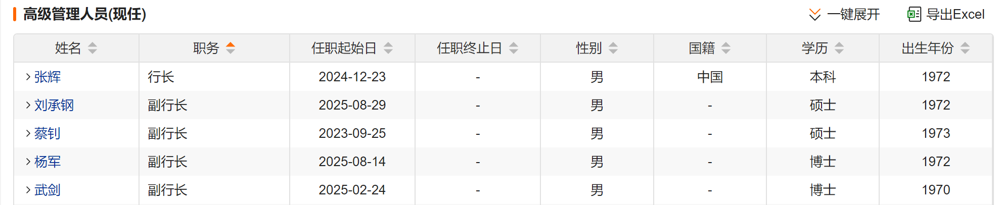 据中国银行官网,该行党委书记、董事长为葛海蛟,当前高级管理层包括副董事长、行长、党委副书记张辉,执行董事、副行长蔡钊,副行长武剑、杨军,以及副行长兼董事会秘书、公司秘书刘承钢。