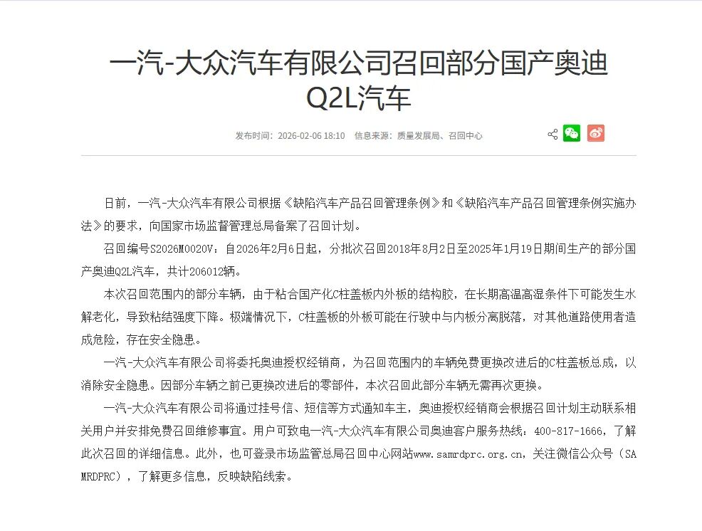 近日,一汽-大众汽车有限公司正式启动大规模召回计划,涉及2018年8月2日至2025年1月19日期间生产的部分国产奥迪Q2L汽车,累计数量达20.6万辆。这一召回计划已通过国家市场监督管理总局备案,依据《缺陷汽车产品召回管理条例》及实施办法执行。