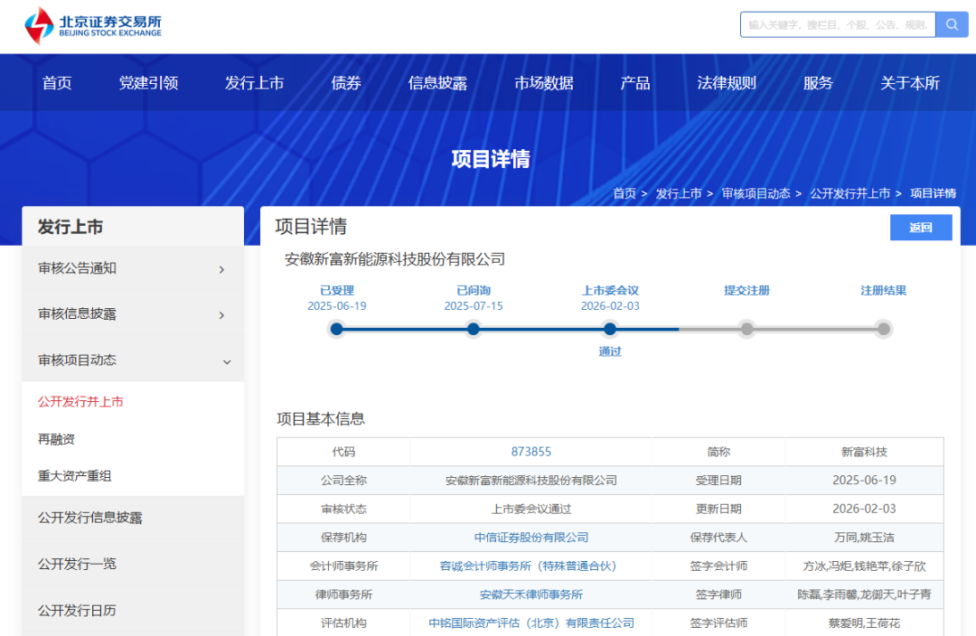 北京证券交易所上市委员会2026年第12次审议会议近日召开,安徽新富新能源科技股份有限公司(以下简称“新富科技”)首发申请获通过。
