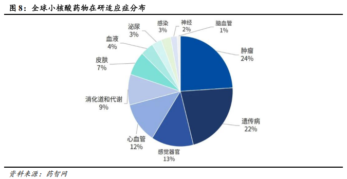 从已获批上市的产品来看,小核酸在罕见病适应症上率先获得突破,包括杜氏肌营养不良、脊髓性肌肉萎缩症、转甲状腺素蛋白淀粉样变性、血友病、家族性高乳糜微粒血症等。从在研管线的适应症来看,排名前五的疾病依次是肿瘤(24%)、遗传病(22%)、感觉器官疾病(13%)、心血管系统疾病(12%)、消化代谢性疾病(9%)。此外,小核酸药物也在皮肤病、血液病、泌尿、感染等多个领域布局。伴随着小核酸药物技术的进步,小核酸药物在慢病治疗领域的应用正逐渐从罕见病向高血脂、高血压、减重等常见慢病延伸。2020年12月,降胆固醇药物Inclisiran获欧盟批准,小核酸药物适应症从罕见病延伸至心血管慢性病领域。