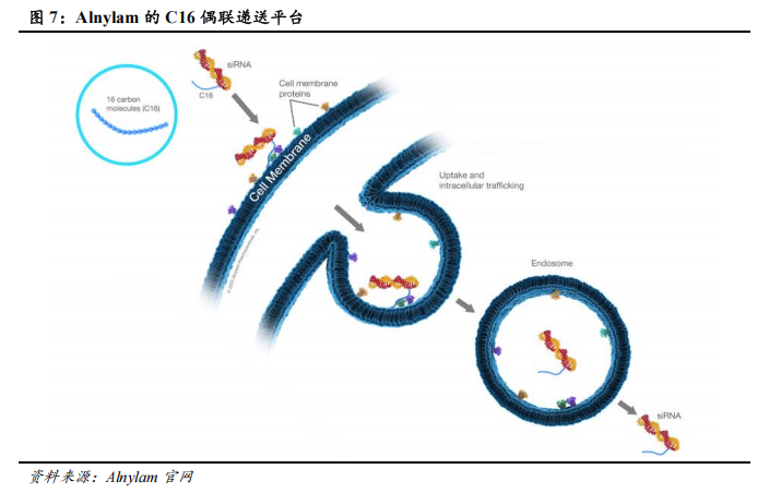 Alnylam的C16偶联递送平台是一种利用脂质链-细胞膜相互作用的药物递送系统。十六烷基(C16)是一种连接到siRNA的短脂质链,其亲脂性得以与细胞膜相互作用,帮助药物穿透血脑屏障或肺部血管,实现精准递送。C16可以被多种细胞吸收,包括中枢神经系统和肺部的细胞。Alnylam基于C16平台已研发出3款处于临床阶段的siRNA疗法:ALN-APP(适应症为:脑淀粉样血管病、阿尔茨海默病)、ALN-HTT021(适应症为:亨廷顿病)、ALN-SOD(适应症为:肌萎缩侧索硬化症)。