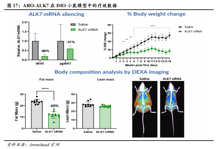 Arrowhead的ARO-ALK7为全球首款靶向脂肪组织的RNAi在研疗法,旨在降低Activin受体样激酶 7 (ALK7) 在脂肪中的表达。ARO-ALK7的临床前研究数据显示:(1)在DIO小鼠模型中,每周注射3 mg/kg ARO-ALK7,第16周时,腹股沟白色脂肪组织和性腺周围白色脂肪组织中ALK7 mRNA表达量分别下调80%、40%;相比于生理盐水对照组,ARO-ALK7可显著抑制体重增加39%,脂肪量减少约50%,并保持瘦肉体重。(2)在食蟹猴模型中,单次注射3mg/kg剂量的ARO-ALK7,1个月后脂肪组织中的ALK7 mRNA沉默89%,并在12周内保持75%左右的沉默水平。ARO-ALK7于2025年5月进入I/IIa期临床研究。