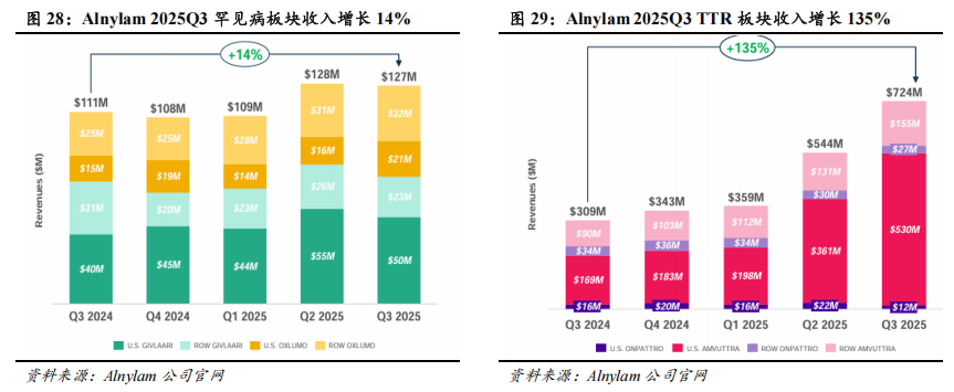 Alnylam是RNAi治疗领域的开创者,成立于2002年,于2018年实现公司首个RNAi药物(也为全球首款)商业化。截止目前,公司已有6款RNAi产品获批上市,7项管线处于临床III期阶段,17项管线处于临床II或I期阶段。公司产品管线聚焦的疾病领域包括:TTR(转甲状腺素蛋白淀粉样变性疾病)、罕见病、心血管、代谢、神经系统疾病。其中,在TTR疾病领域,Alnylam进行深入布局,并不断升级迭代TTR靶向药物,具体产品管线包括:(1)静脉注射、每三周给药的Patisiran;(2)皮下注射、每三个月给药的Vutrisiran;(3)疗效更好、每半年给药、处于临床III期的Nucresiran。受益于Vutrisiran(Amvuttra)ATTR-CM成人患者适应症获批,TTR板块收入呈现快速增长,已成为Alnylam营收增长的主要动力。